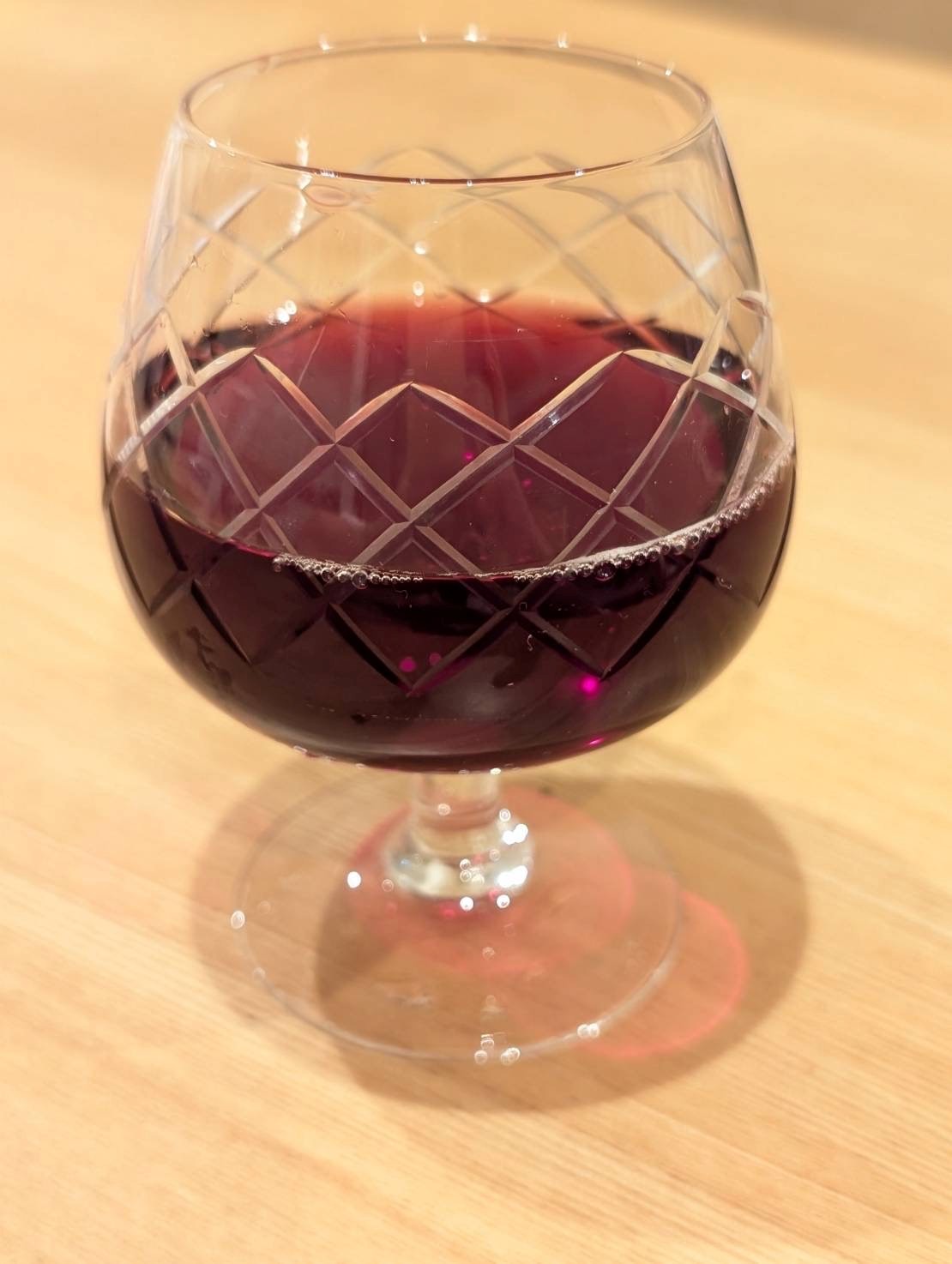 ①ヘルシービネガーと赤ワインをグラスに注ぐ。
